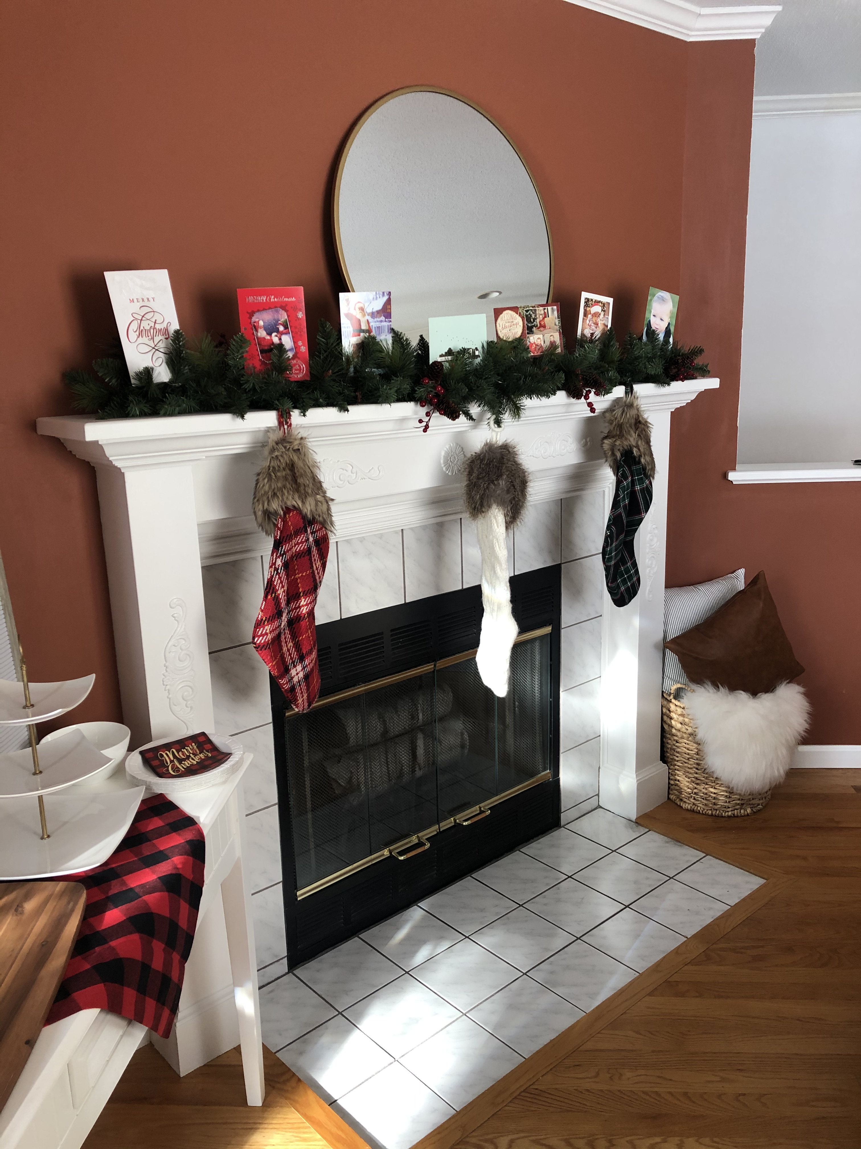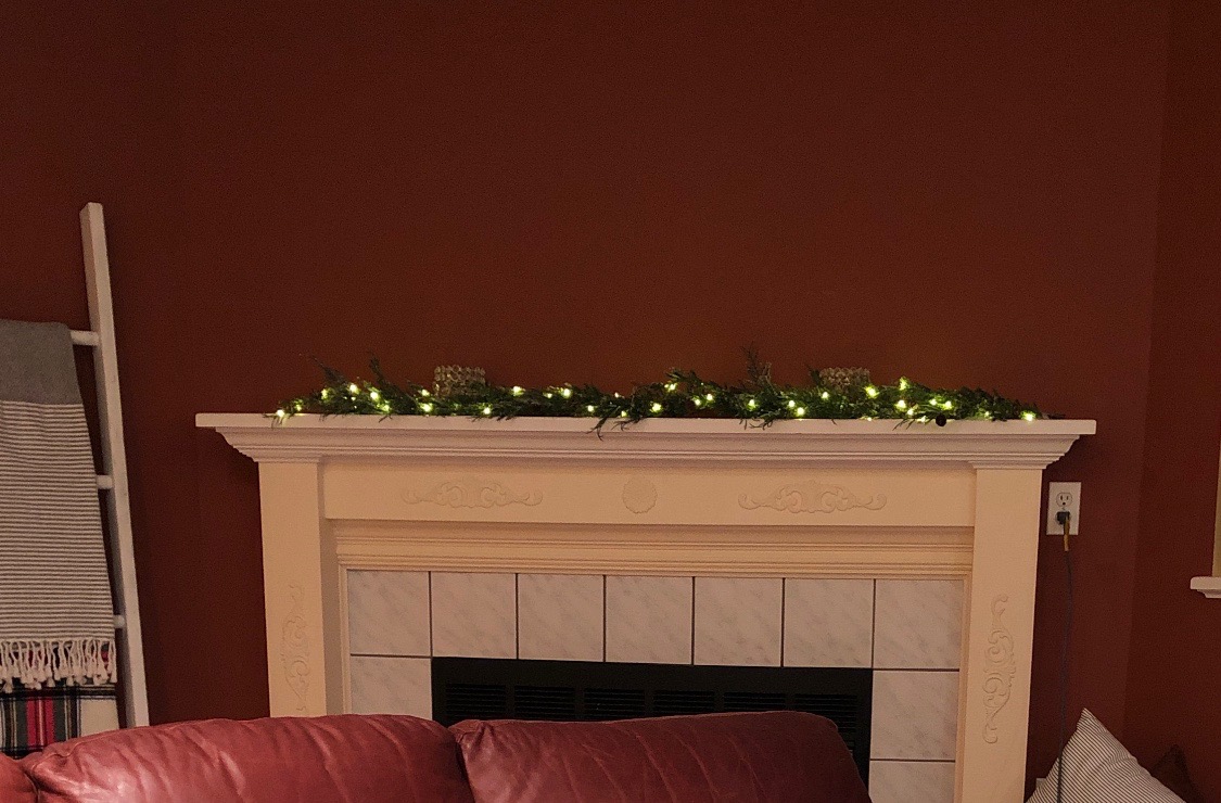 In December, I started off by painting only the mantel. It was around the holidays and I figured a “redish” wall against a white mantel may not look so bad. I ended up taping off the mental, priming it first, and then painted it white or “Snowbound” by Sherwin William in satin eg-shel finish in the Emerald (SW 7004).
